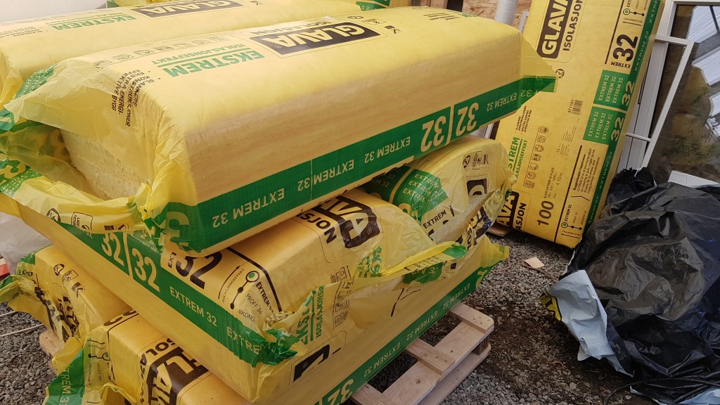Har lenge vært klar for gulv, men nå nærmer det seg veldig. Jeg hentet isolasjon fra byggevareforetningen i går. Nå vet jeg ikke hvor mye det er normalt å føle for noen livløse ruller mineralull, men det var faktisk veldig stas å få de på plass i byggeteltet. Følte liksom det fulgte med noen gode voksenpoeng på å kjøpe isolasjon. Da leker en på en måte ikke butikk. Eller, det gir det i hvert fall inntrykk av. Isolasjonmaterialer er et av mine gjenbruksunntak. Det må bare være av en viss kvalitet og dimensjon for å passe mitt gulv, vegger og tak.