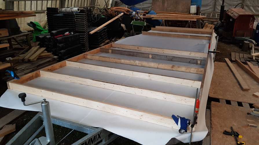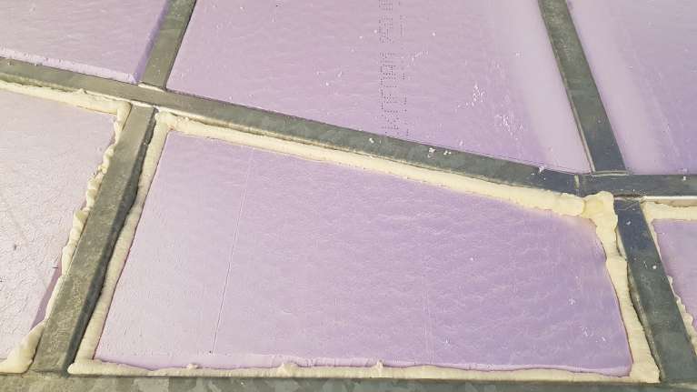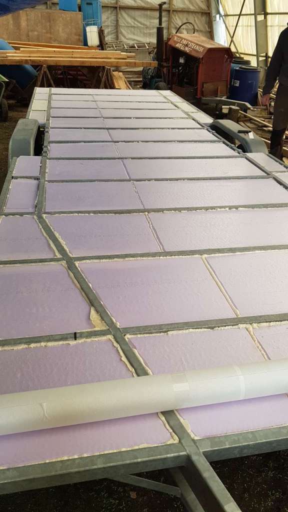 Første milepæl har vært å få limt ferdig isolasjonsplatene inne i hengeren og lagt på vindsperren. Det er på en måte første isolasjonslag, selv om det er noen effektive kuldebroer gjennom stålbjelkene. Etter påføringen av fugeskummet (limet) så det ut som en matematikers bløtkake i langpanne med krem i rette vinkler.