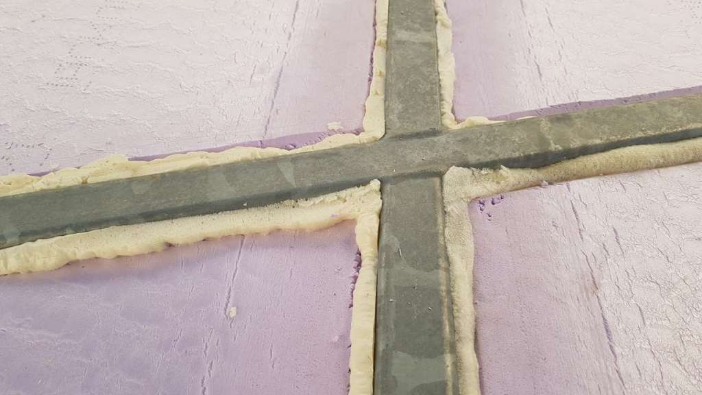 Stivnet skum som stikker over stålbjelkene skjæres bort