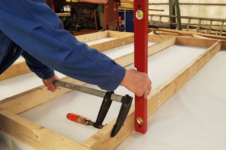 Det hjelper ikke på farten at noen av plankene er vridde og akkurat litt for ulik høyde til at det antagelig ikke gir knirking i gulvet. Men vi har en metode for de plankene, og det involverer en solid tvinge og et vater: planken spikres først fast i den ene enden der den skal være. I den andre enden vrir en person planken rett med tvingen, mens en annen spikrer den fast. Stoler du på eget øyemål kan du selvfølgelig droppe vateret. Planker er stive, men ikke stivere enn at de gjerne kan overtales til å innta en rettere positur. Noe à la mafiafilmene: vi gir de et tilbud de ikke kan avslå…