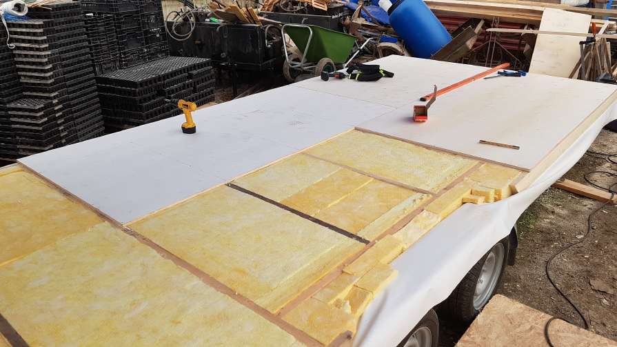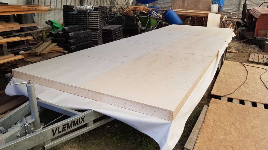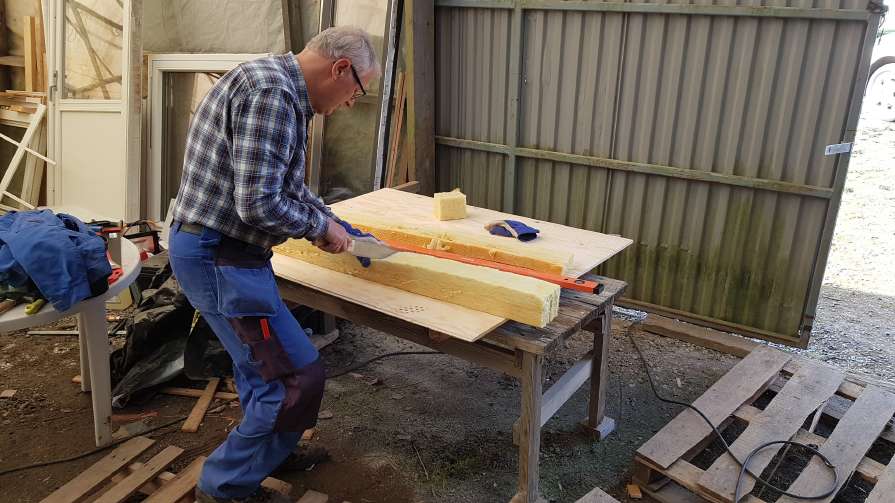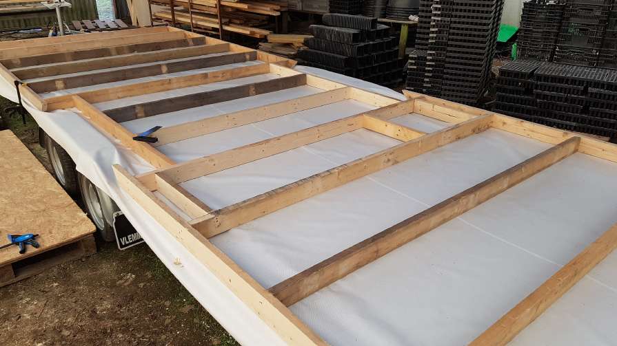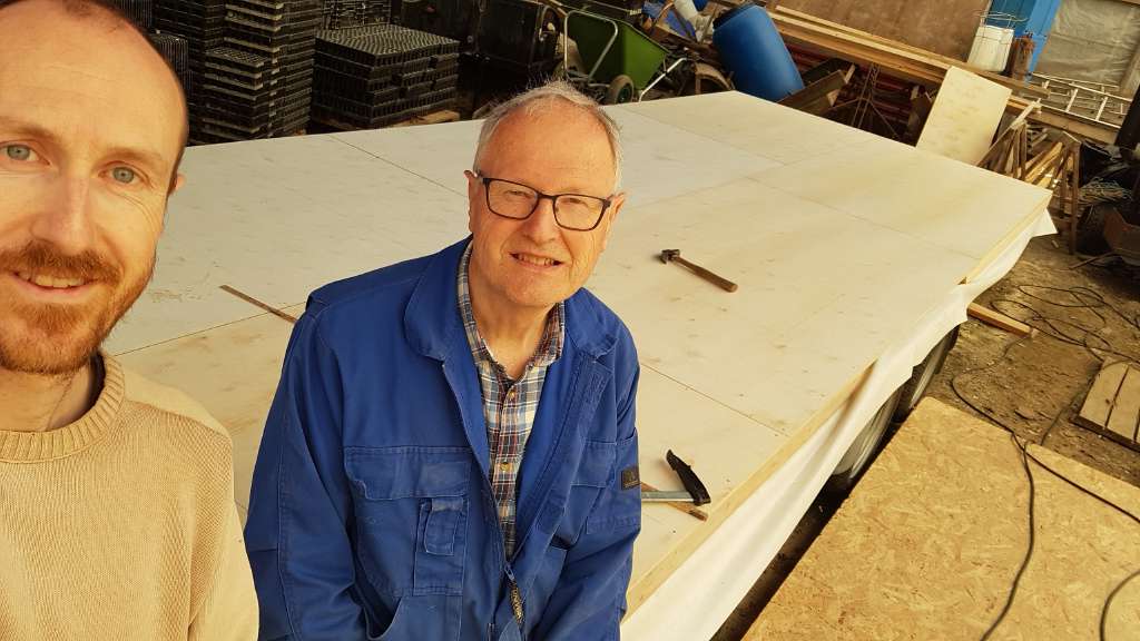 Arbeidshjelp av nevenyttig far og mentor i praktisk arbeid har fått prosjektet et sjumilssteg videre idet det gikk fra en gulvklar henger med noen løse planker på til ferdig gulv på fire gode arbeidsdager. Det er garantert ikke en imponerende fart for de proffe, men vi er storfornøyde som glade førstegangsamatører.