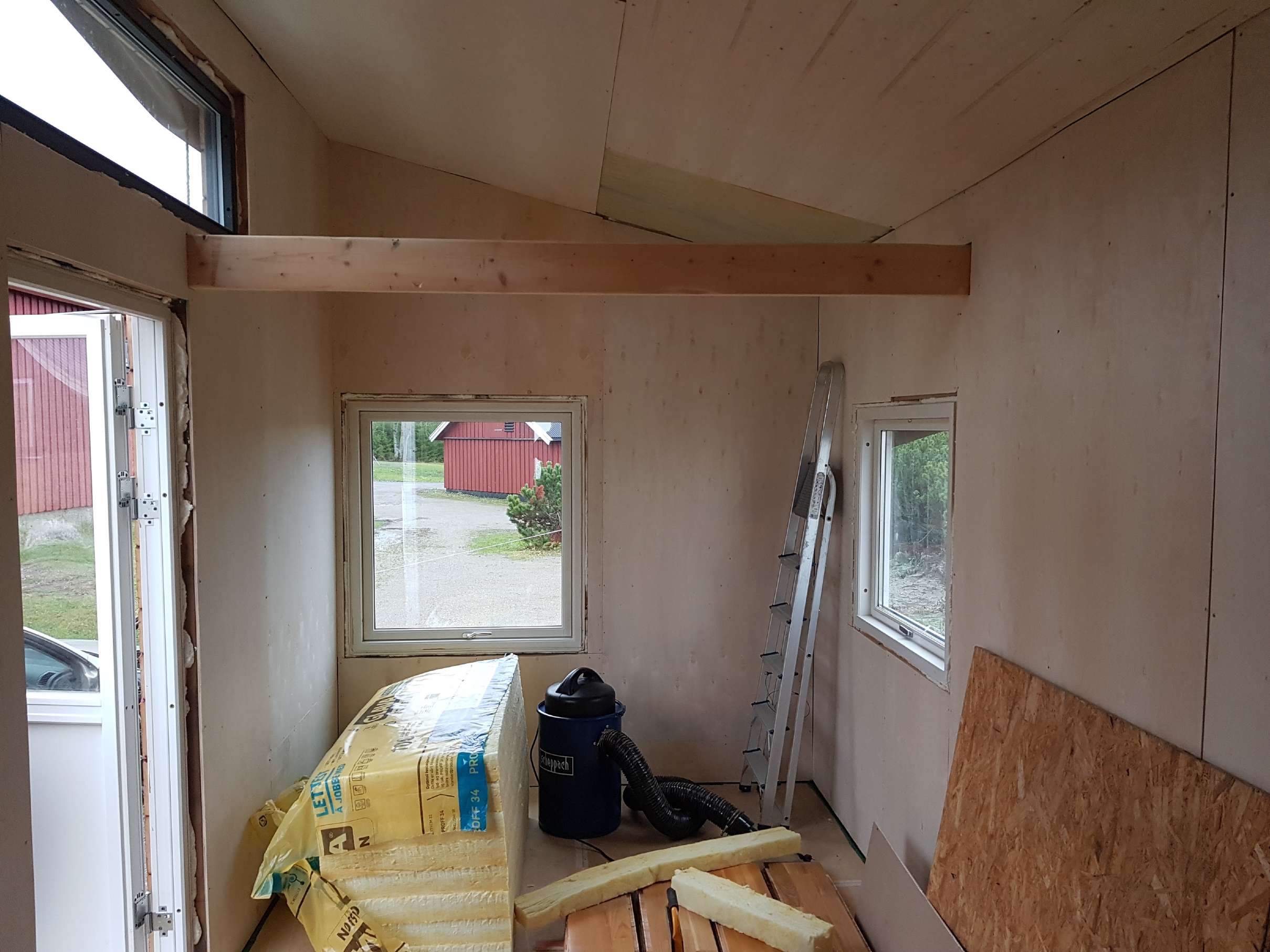 De neste stegene er å få rørlegger til å lage sluk i badet, og en kar skal legge belegg (en belegglegger?) på gulv og vegger der inne. Så må kjøkkenbenk og et teknisk skap på plass for å installere resten av røropplegget for vann. Elektriker må også inn for å gi meg strøm til lys, matlaging og omtrent alt annet som krever energi. Bortsett fra varmen fra vedovnen blir jeg helt avhengig av å være påkoblet et strømnett. Jeg har egentlig blandede følelser rundt det, men det er slik det blir nå, og det er selvfølgelig på mange måter veldig lettvint.
