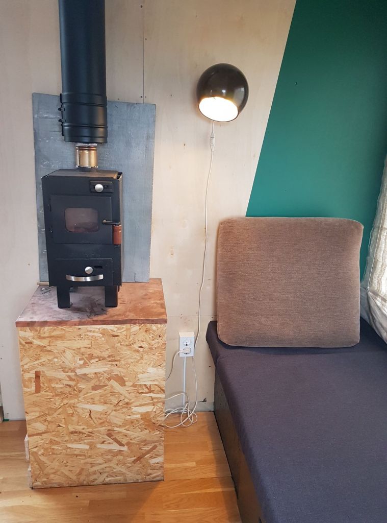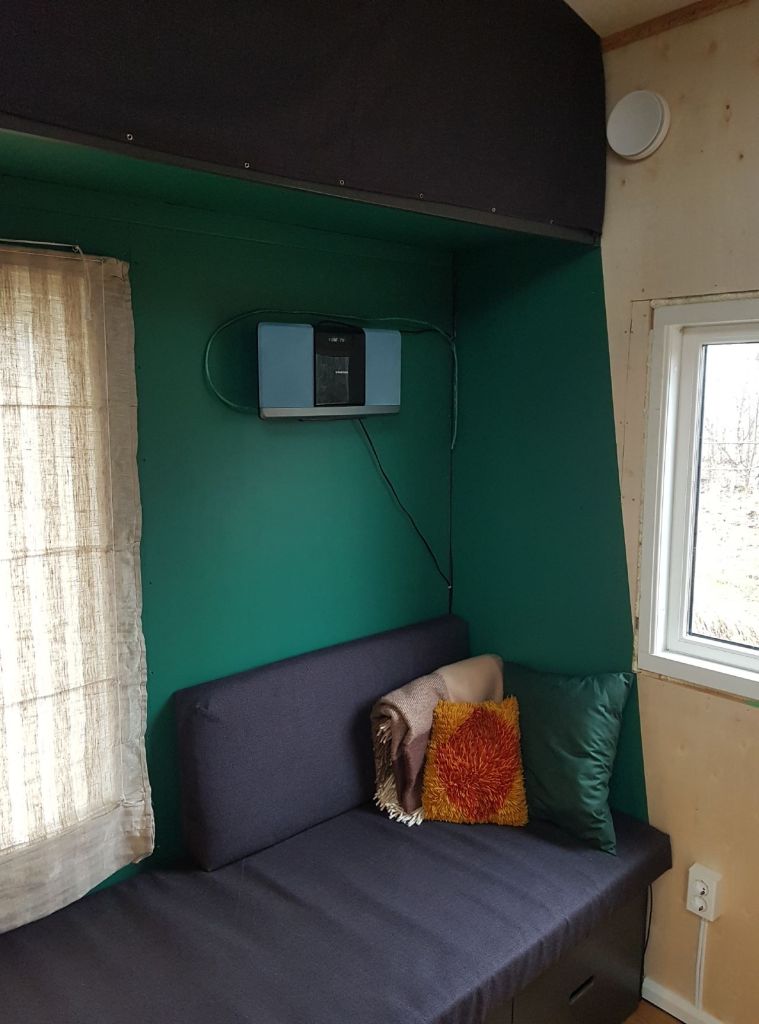 Sofakroken har fått en litt grønnere grønnfarge enn hemsen og et forheng over sofahylla for å skjule diverse skrot (dvs. vinterting, gjestedyne, bærplukker, etc.). Benkeputen er en gammel køyesengmadrass som jeg har sydd nytt trekk til sammen med min gode mor, og de store ryggputene er også ombruk av puter foreldrene mine har hatt på lager fra langt tilbake. Skuffene under sofaen er malt i en slags kokssvart farge.