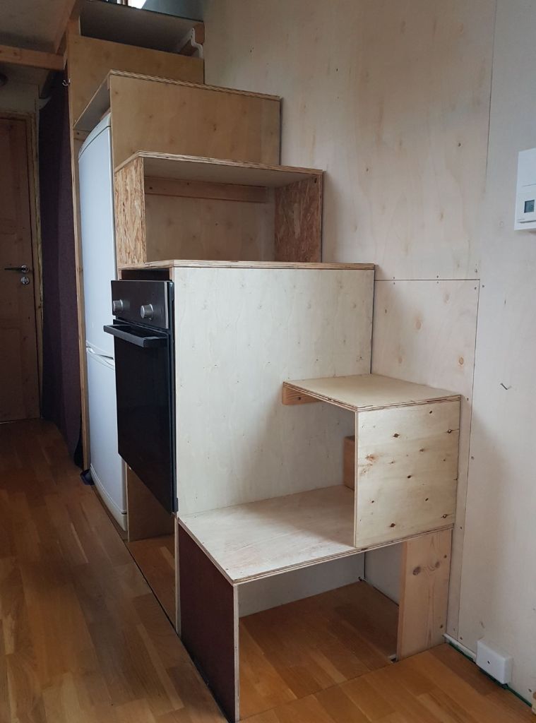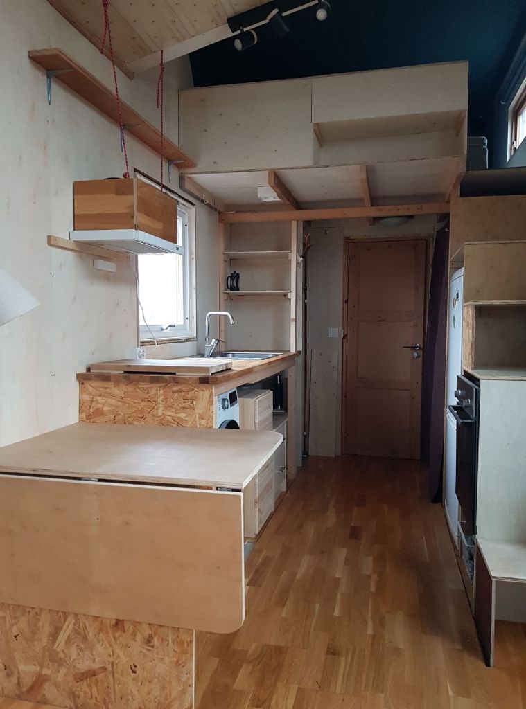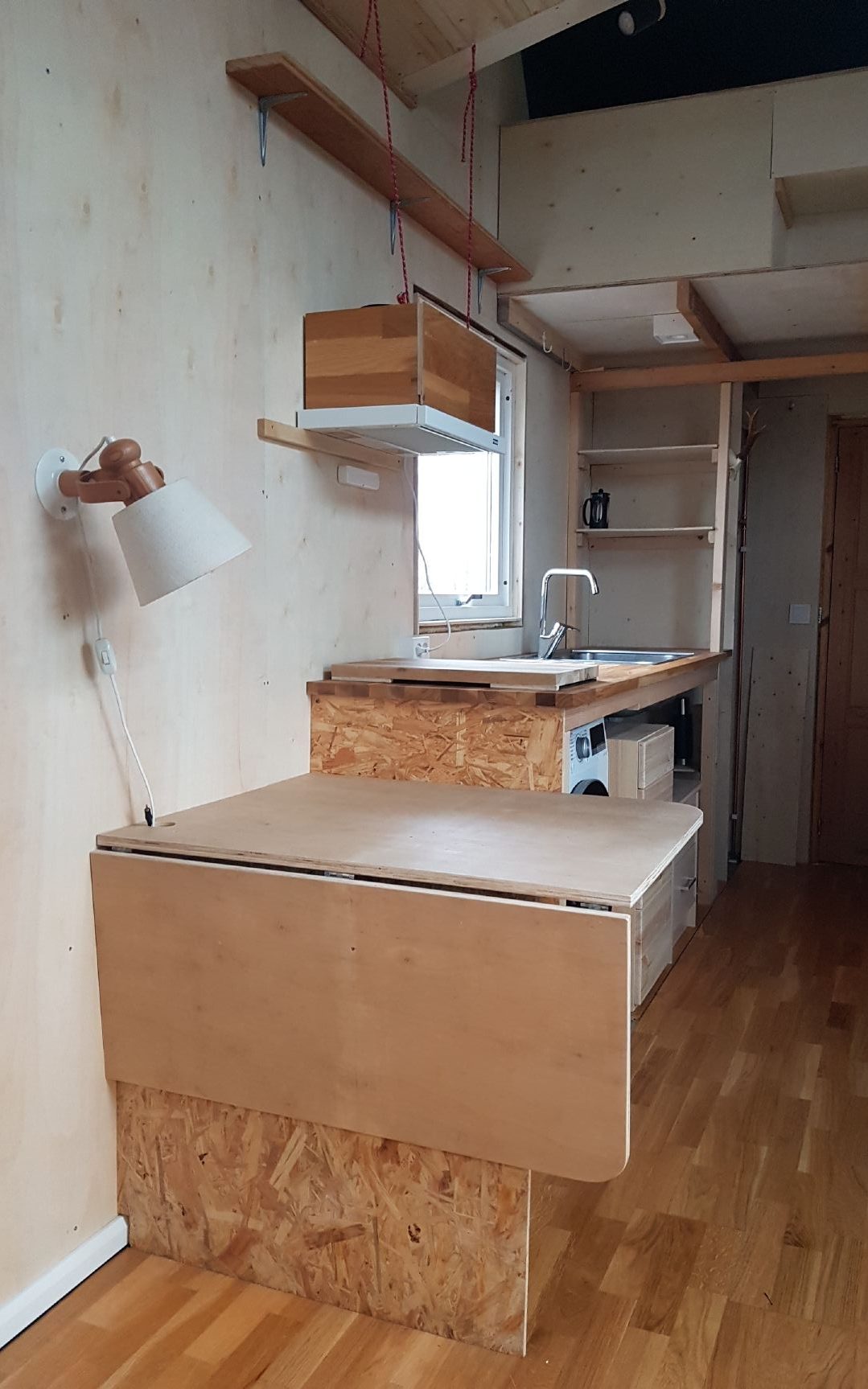 Noen rene fakta: Kombinert arbeidsbord og spisebord med klaff er oppe, men støtte(r) for å holde klaffen oppe må fortsatt tegnes og lages. Trappen til hemsen har trinnhøyde på 30cm og rommer kjøleskap/fryseboks og stekeovn i tillegg til hyller for bøker og sko. Trinnhøyden er merkbart høyere enn i en normal trapp, men en brattere trapp sparer viktig plass. Jeg tenker at en kan bli vant til alt mulig, inkludert dette, forhåpentligvis.