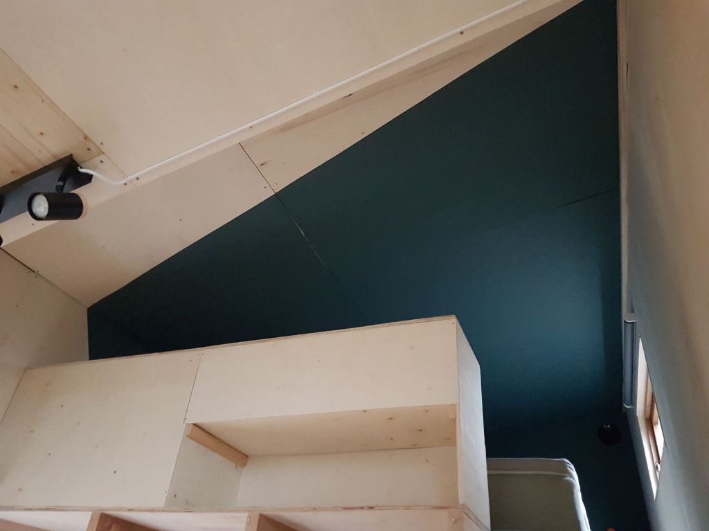 Bildet over viser hylleseksjonen på hemsen og taket innenfor. Den ene fjerdedelen av hylla er åpen mot stua og skal være bokhylle, mens resten av hylleseksjonen vender mot hemsen og skal brukes til sengetøy og annet tøy. Taket innover hemsen er malt mørkegrønn for bedre søvn – med en småfrekk skrå malingskant i taket og på veggen til venstre, om noen ble litt forvirret av geometrien der.