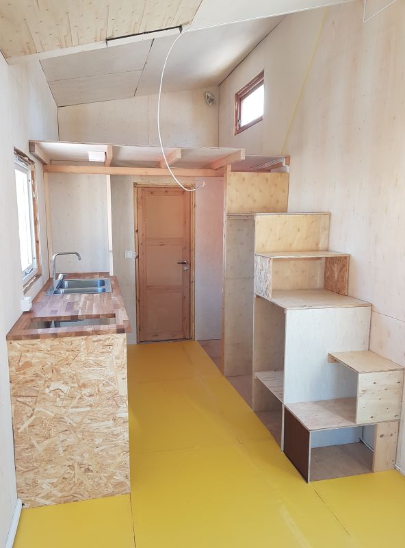 Et annet alternativ er å ha en slags sovesofa som konverteres fram og tilbake mellom sofamodus og sengemodus, men det tror jeg fort en (jeg) blir lei av hvis det blir mye jobb. Et tredje alternativ er en seng som en diger uttrekkbar skuff på hjul under en opphøyd stue eller kjøkken, slik som hos Minim Homes. Da må en ha nok fri gulvplass til å trekke ut senga på, men fordelen er at et eget «rom» for soving spares og at senga ikke krever mer enn å trekkes ut – ferdig oppredd – for å være klar. Jeg er litt usikker på hvordan gulvkonstruksjonen da bør gjøres for å spare vekt for et hus på hjul, men jeg liker idéen.