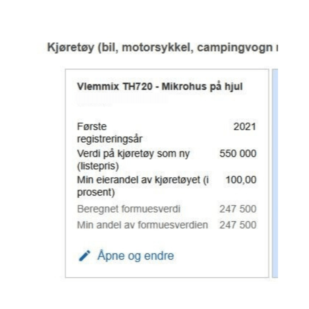 I tillegg sier Skatteetaten at kjøretøyet kan gis et navn som hinter om at det er et mikrohus, så det gjorde jeg etter modellnavnet for hengeren – en Vlemmix TH720. Da så det slik ut i skattemeldingen min: