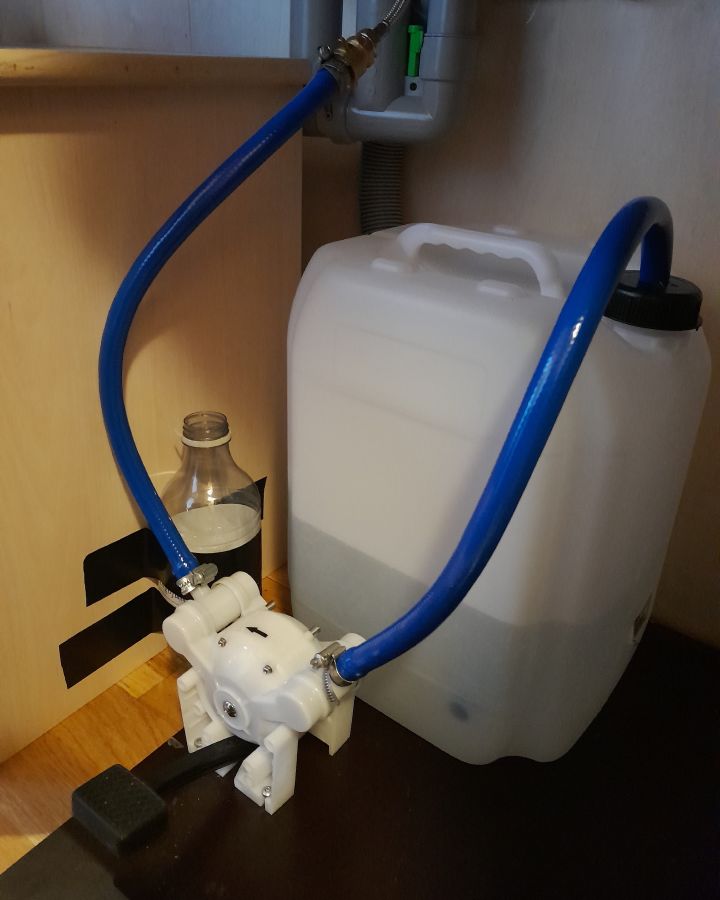 Figuren stemmer godt, men i praksis er lokket for påfylling, slangen til fotpumpen og ventilen slått sammen i ett: slangen går gjennom lokket for påfylling, og hullet i lokket er stort nok til å slippe luft inn i beholderen rundt slangen. Når kannen bæres ut for påfylling i kranhuset dras slangen ut gjennom lokket og puttes ned i den fastteipede flasken slik at det ikke drikkevannslangen må legges på et støvete gulv.