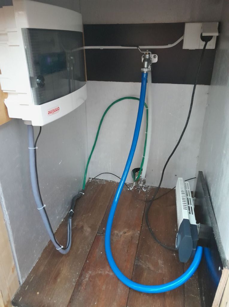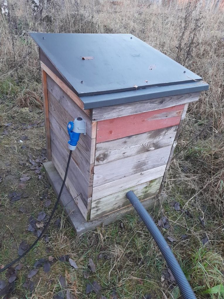 Nedenfor ser du bilder av kranhuset med innredning. Huset er omtrent 1 meter høyt. Det får strøm gjennom en 1-fas kobling på utsiden, trukket inn til et dobbeltstikk på innsiden. Dobbeltstikket gir strøm til frostvakten, en liten ovn på 200W, og til varmekabelen for vannledningen i bakken, via den store kontrollboksen.